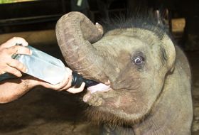In het weeshuis kan men de jonge olifantenweesjes bezoeken.