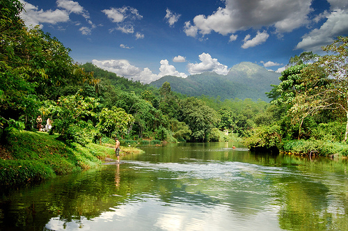 Direct onder het stoffige pad begint de junglebegroeiing aan de steile afdaling. Langzaam trekt de mist op uit de diepte. Onder een helder blauwe lucht kijk je uit over groene, wollige bergtoppen.