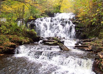 Op de weg naar beneden kondigt een hard geklater de Baker’s Falls aan.