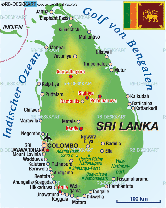 De afstand van het vliegveld is 65 km en van de hoofdstad Colombo 35 km.